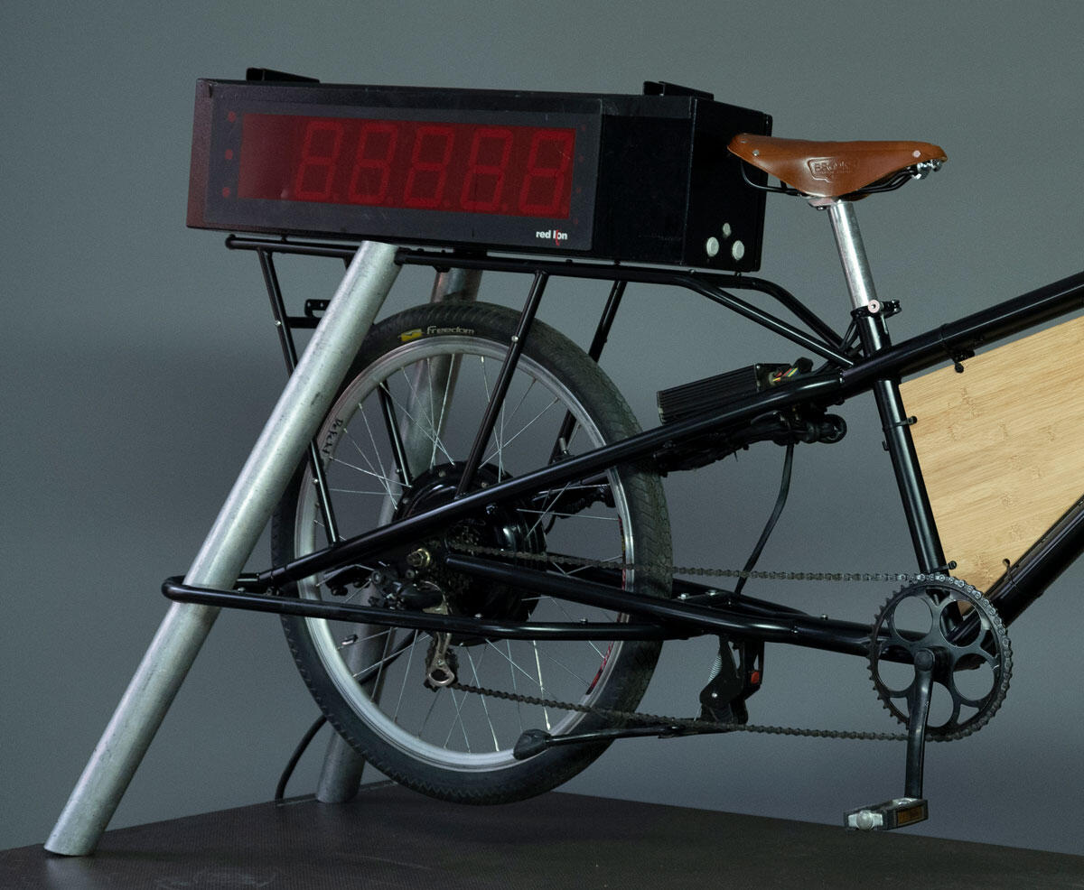 An das Fahrrad wird eine LED-Anzeige angeschlossen, die wahlweise die genaue Watt-Anzahl oder die erzeugte kW/h anzeigt, die aktuell oder im Rahmen der gesamten Veranstaltungszeit erzeugt wurde.