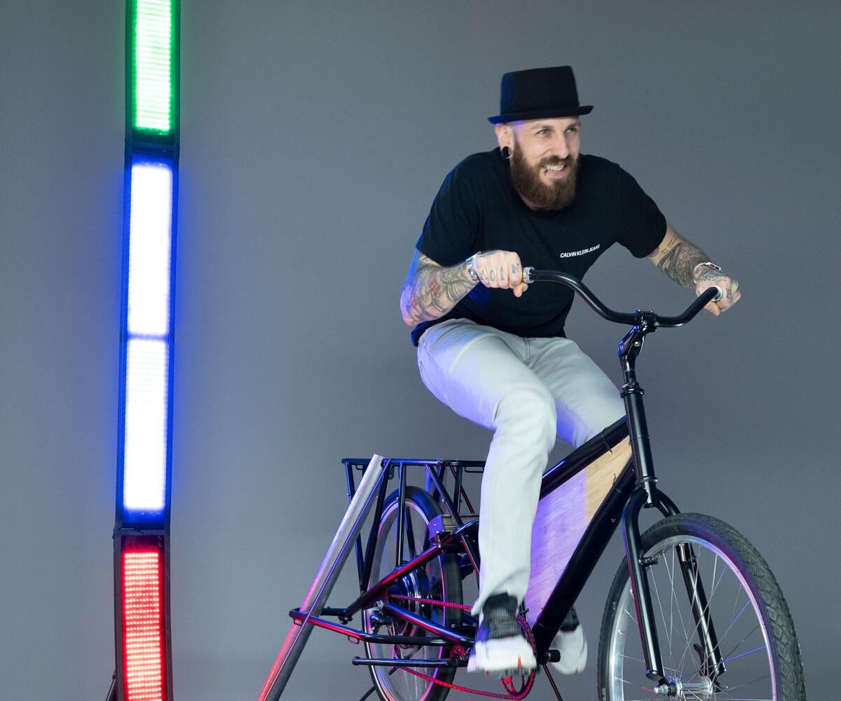 Unser Tritt den Lukas-Modul funktioniert analog dazu. Doch statt mit einem Hammer zu zuschlagen, treten die Teilnehmenden in die Pedale, um genügend Strom zu erzeugen damit die „Tritt den Lukas“-Säule zum Leuchten gebracht wird. Kräftemessen und Spaß auf höchstem Energielevel!